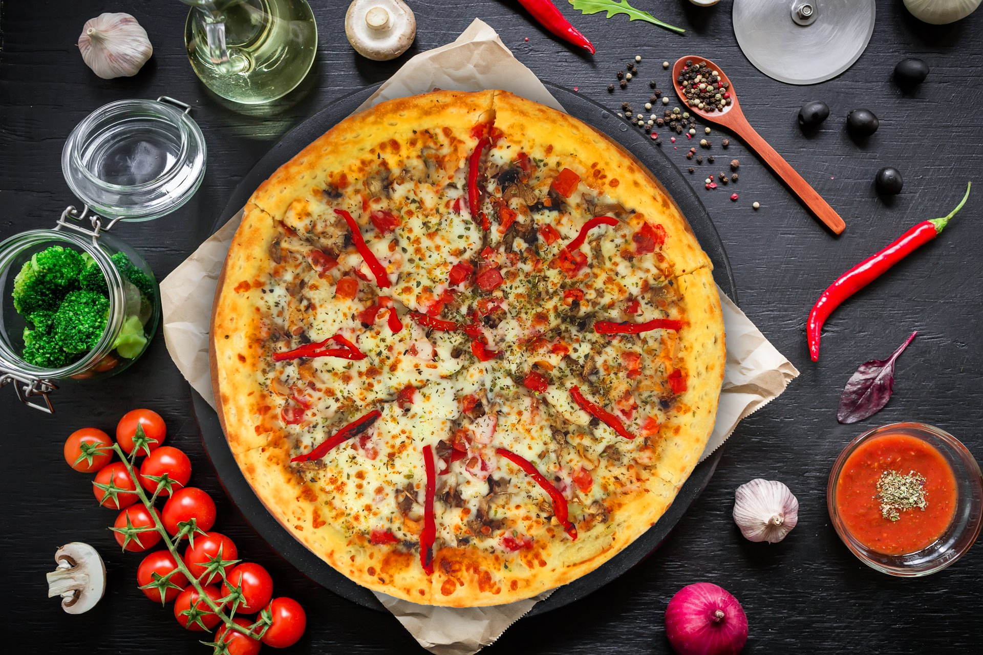 -Pastırma, domates, yeşil biber, kırmızı biber, mantar, soğan, kaşar peyniri