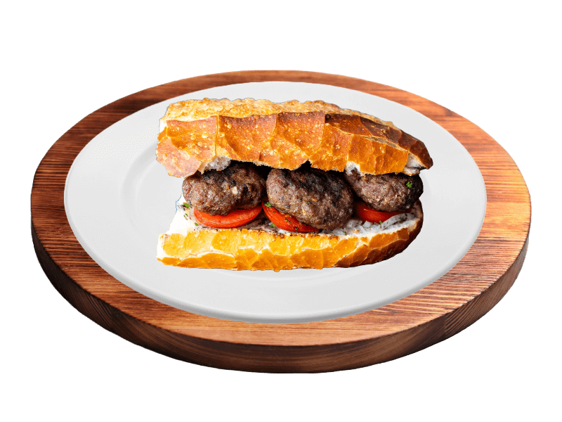 120 gr ev yapımı et köfte, kaşar peyniri, domates, soğan, sumak