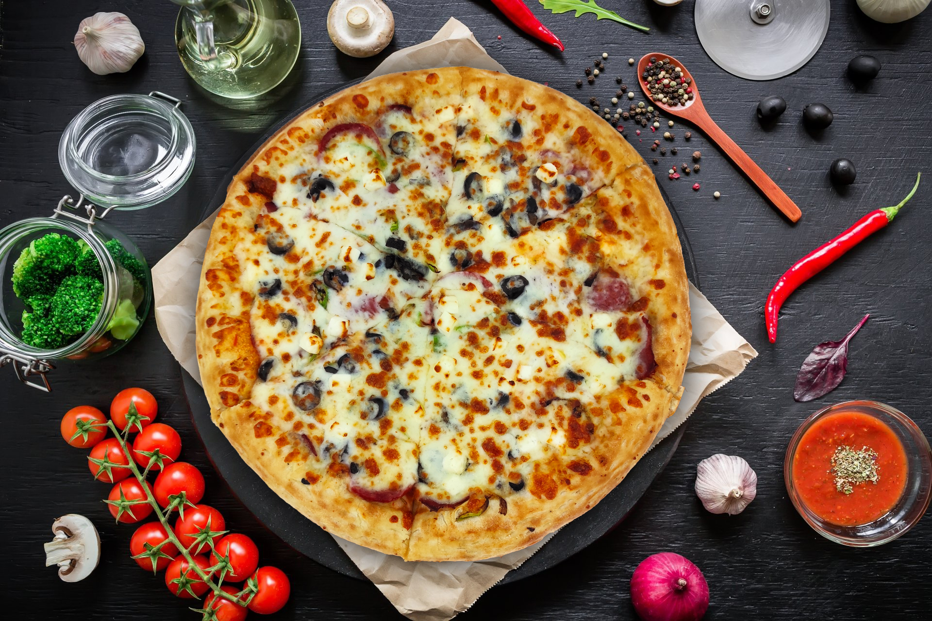 Orta boy pizza hamuru, pizza sosu, mozzarella peyniri, mantar, cherry domates, siyah zeytin, yeşil biber, keki...
