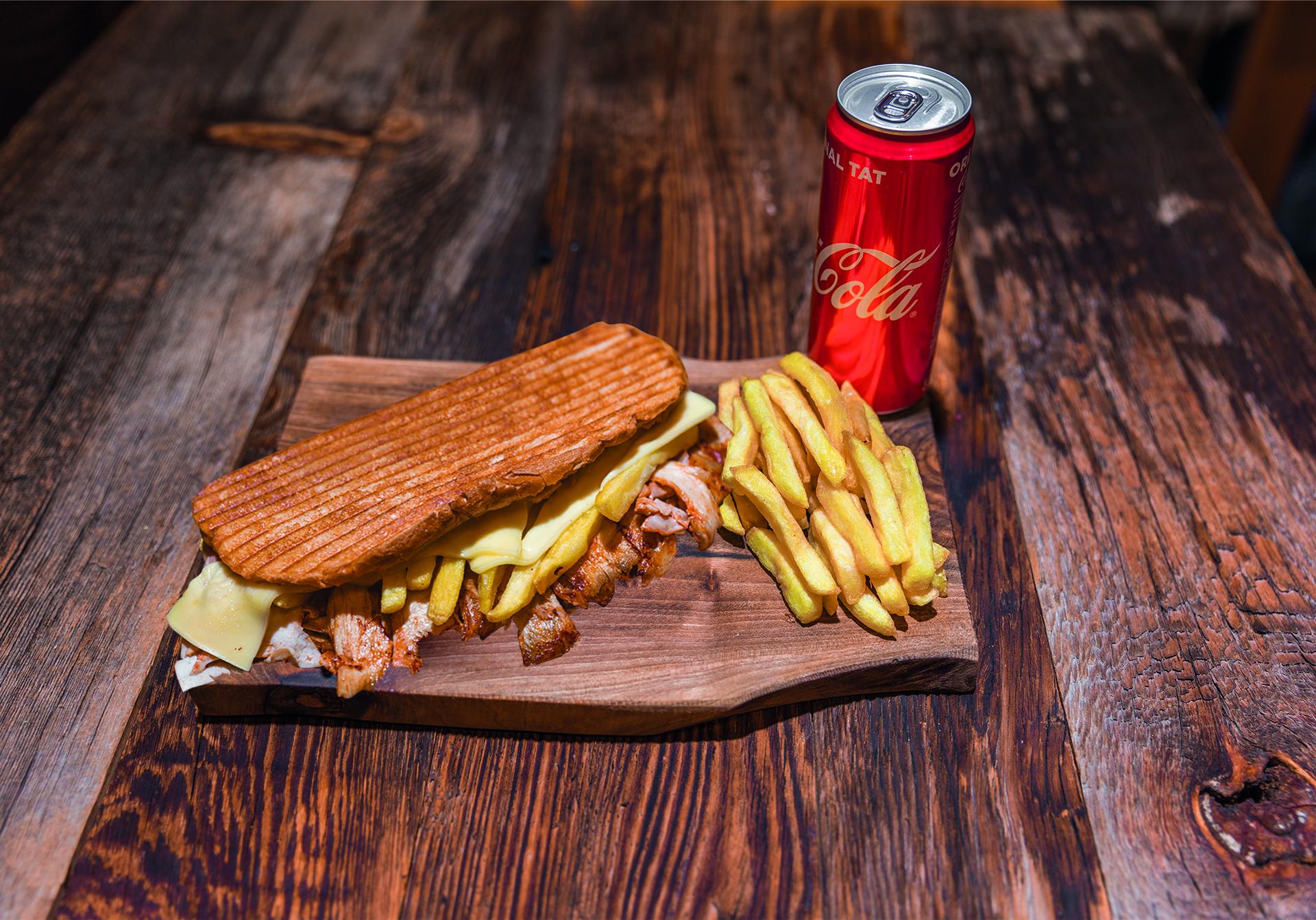 Ayvalık tostu (salam, sosis, sucuk, kaşar peyniri, turşu, ketçap, mayonez), patates kızartması, coca cola (330...