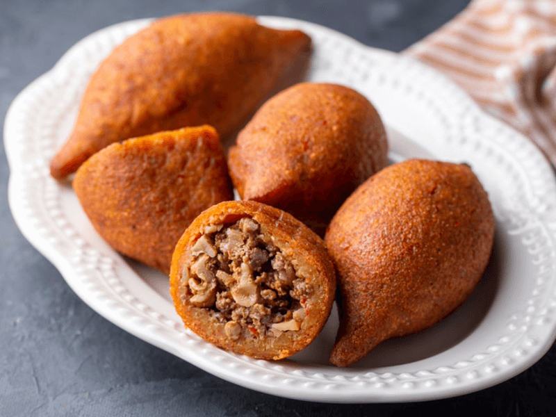 1 adet ev yapımı kızartılmış etli içli köfte, turşu, domates