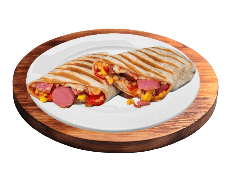 Tortilla ekmeği, salam, sosis, sucuk, kaşar peyniri, domates, turşu, ketçap, mayonez